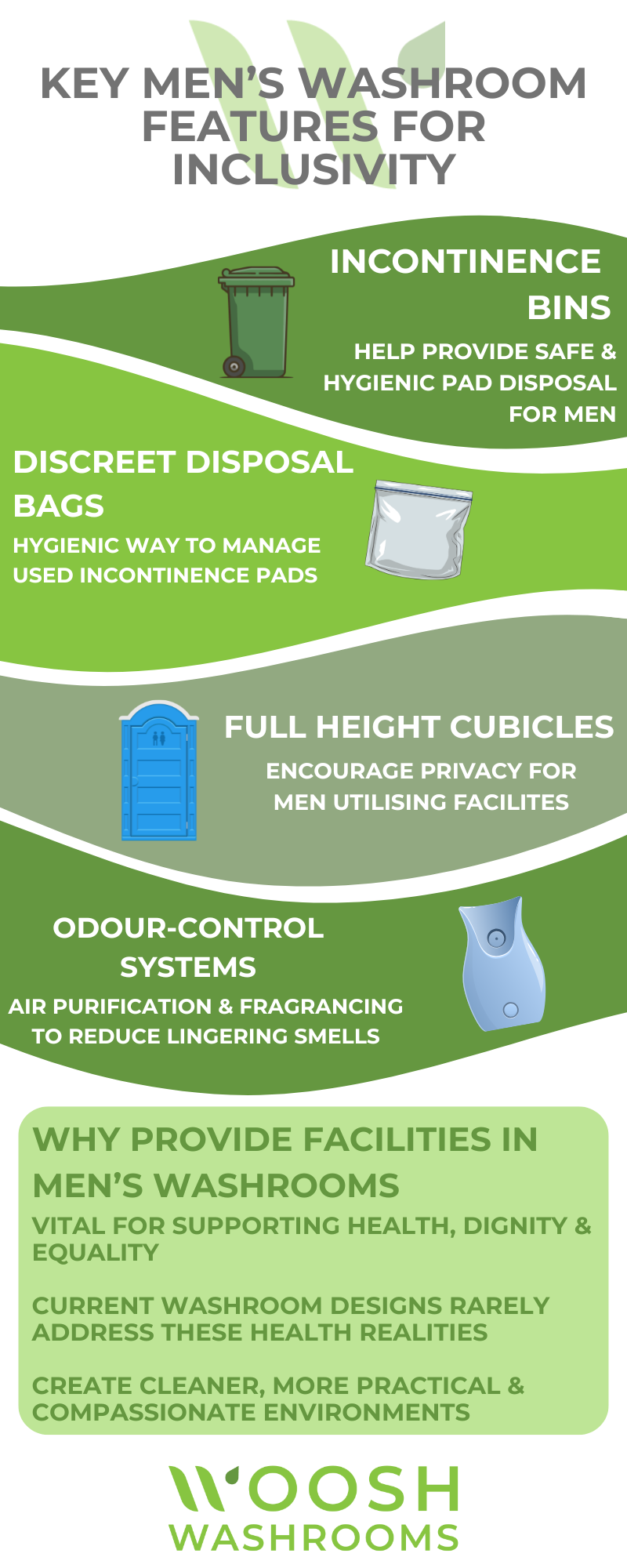 - Partner with professional hygiene providers - Woosh offers incontinence waste bins, servicing and odour controlled solutions for male washrooms.